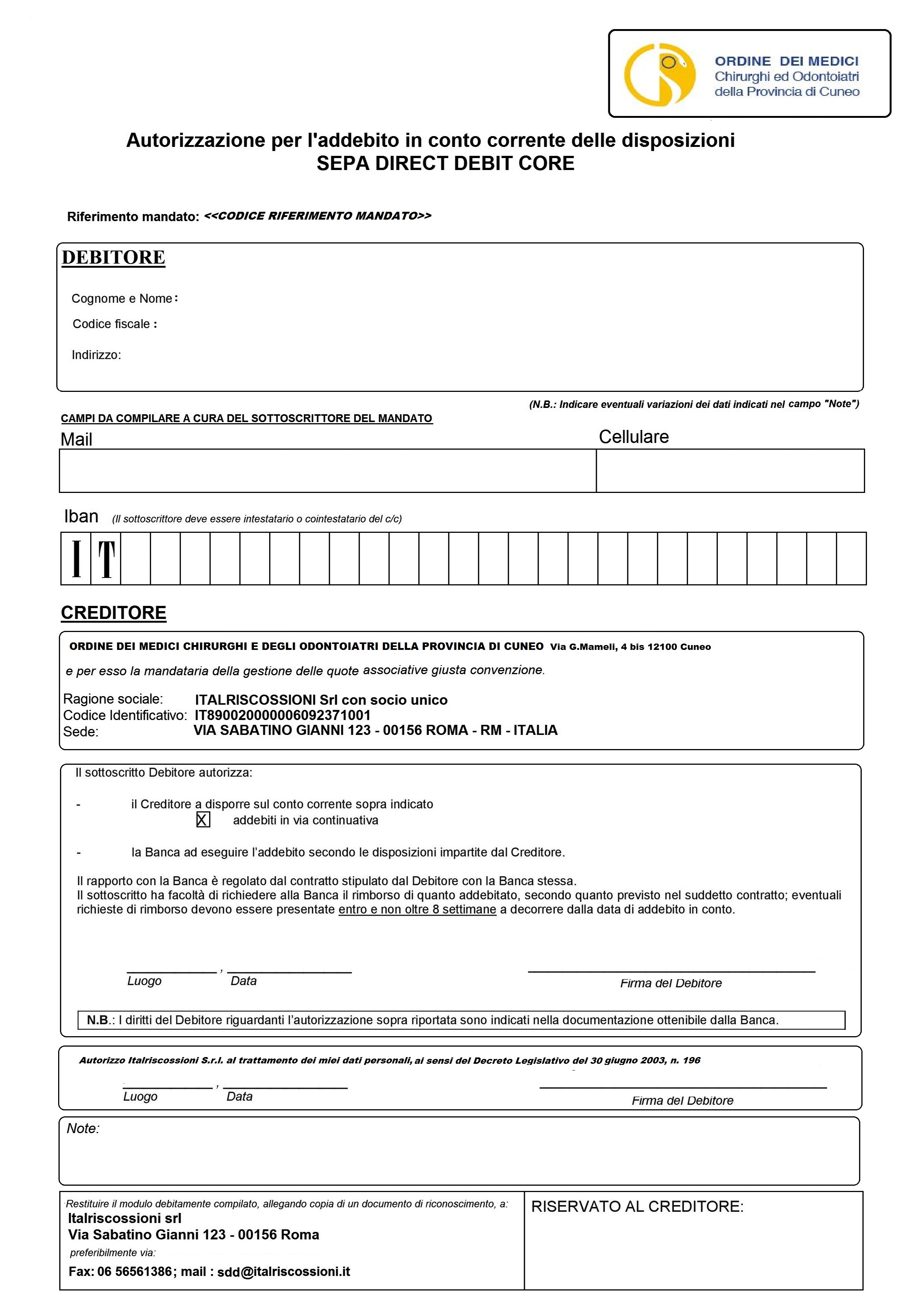 Se è stata opzionata la domiciliazione bancaria ed è intervenuta una variazione dell'IBAN è necessario inviare email a info@italriscossioni.it indicando NOME-COGNOME-C.F. ed IBAN NUOVO.